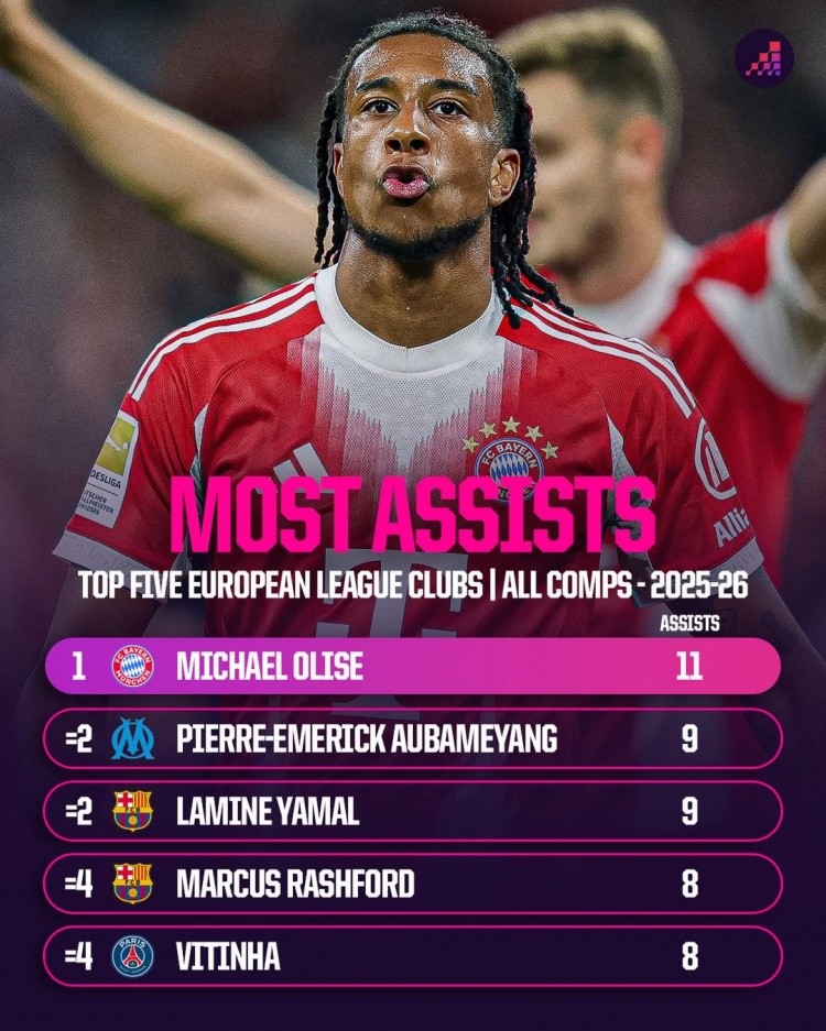 直播吧12月10日讯拜仁边锋奥利塞本赛季的状态持续火热。据Opta数据统计,在欧洲五大联赛各项赛事的助攻中,奥利塞以11次助攻位列榜首。