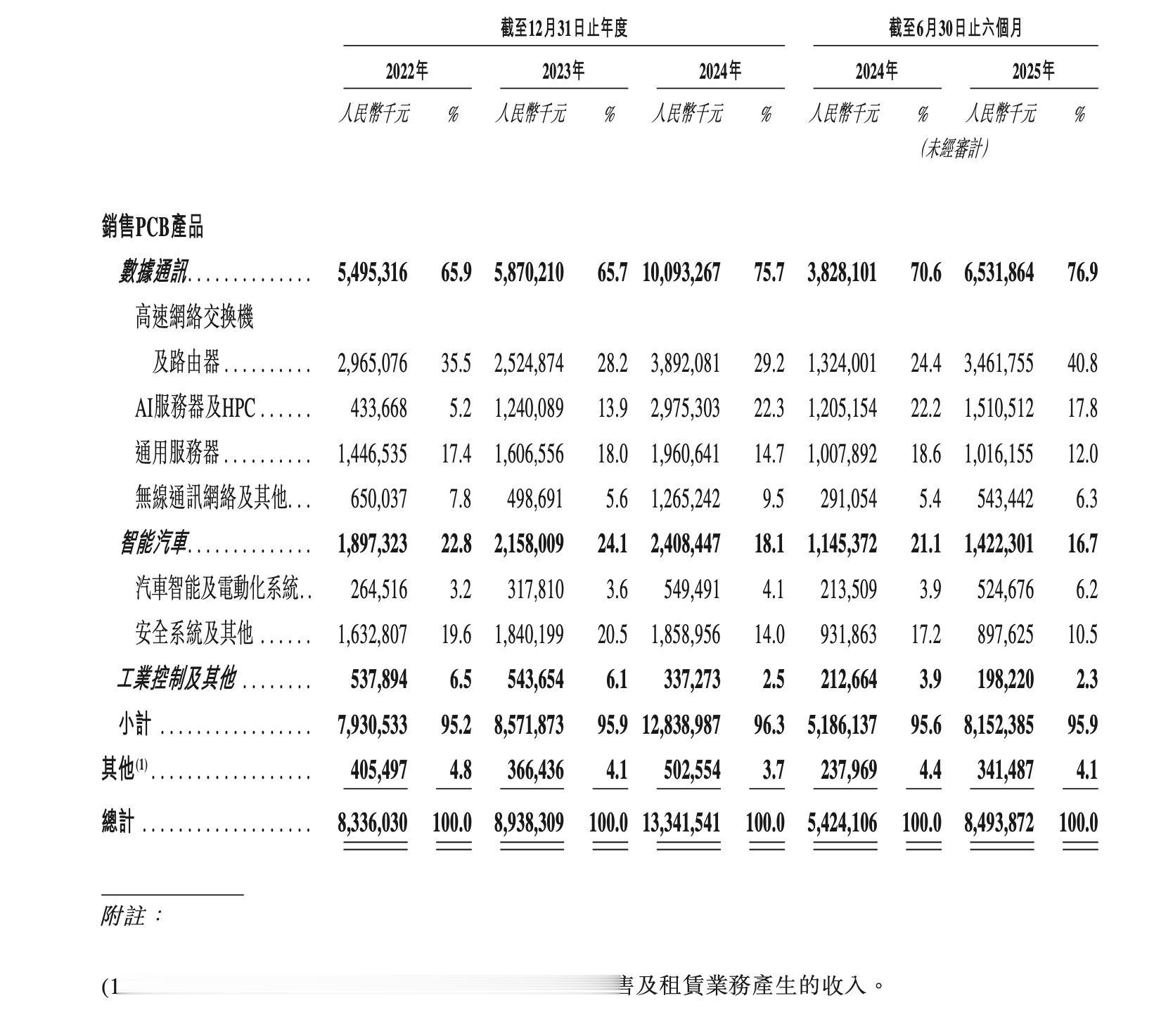 其中,数据通讯分部为公司的最主要营收来源,持续贡献七成左右的收入。根据财务数据显示,2022年至2024年,数据通讯业务收入分别为54.95亿元(人民币,下同)、58.70亿元和100.93亿元,占总营收比重由65.9%上升至75.7%,成为驱动公司业绩增长的核心引擎。尤其在2024年,随着AI服务器与高性能计算(HPC)需求爆发,AI服务器及HPC相关PCB收入达29.75亿元,同比增长133.6%,相关比重提升至22.4%;高速网络交换机及路由器收入亦保持稳健增长,达38.92亿元,占比29.2%。