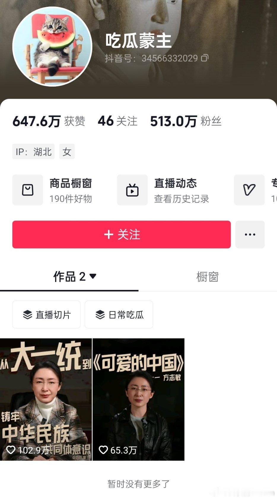 吃瓜蒙主现在500万粉丝了。大部分视频都看不见了,现在也不更新了。我记得几天前还有三个作品的。现在只能看见两个作品了。她讲的红楼梦和清史 史观非常火,全是切片。