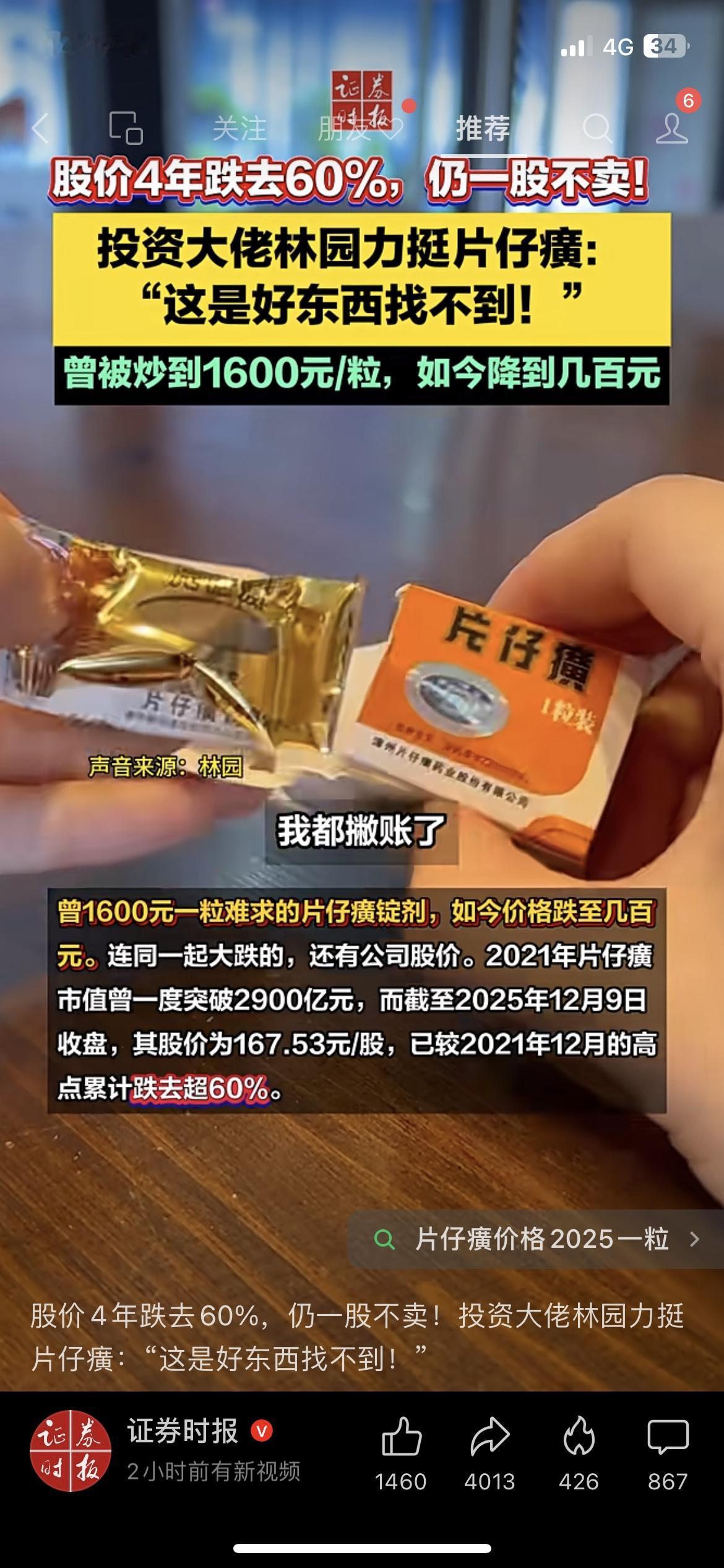 😲片仔癀凉了?股价4年跌60%,林园却死拿不卖还高调力挺! 曾经被炒到1600元/粒、一粒难求的片仔癀,如今风光不再,产品价格跌到几百元,公司股价更惨,从2021年高点至今跌超60%,市值蒸发超1700亿。但投资大佬林园在股东大会上却直言“我卖它干什么?这是好东西找不到”,他从2005年就持有片仔癀,还放话目标是卖到2瓶茅台的价格。你觉得片仔癀能重拾往日热度吗?评论区聊聊!