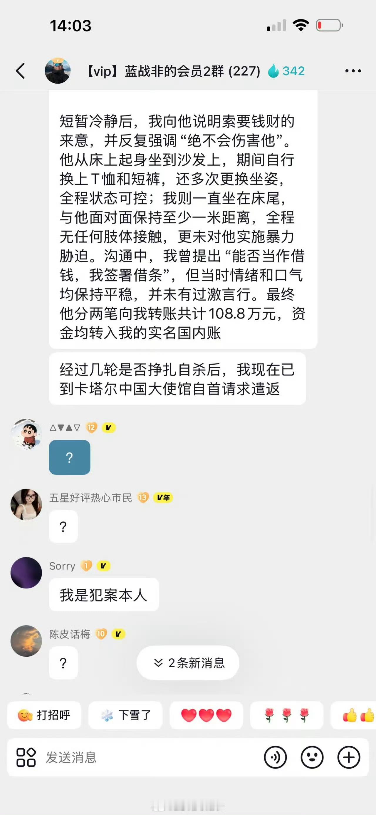 蓝战非案作案人回应蓝战非被绑架事件又新剧情了,有疑似当事人发生,与蓝战非说的大相径庭,所以是谁在撒谎?如果这是真的,那蓝战非也要被处理了,恶意制造虚假内容,激发网友情绪,博取网友关注和流量,这心坏了啊,如果是这人胡编也肯定要进去的