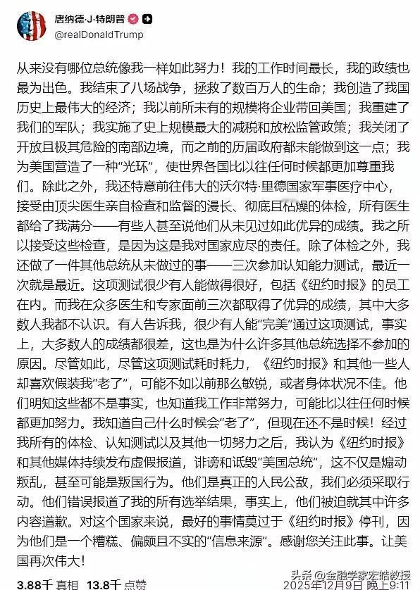 刚刚,特朗普发长文控诉要让《纽约时报》停刊!看下图,特朗普发长文说自己的体检情况,还说自己做了三次认知能力测试,但是过去其他的总统都不会选择参加这项测试。所有的检查和测试都表明特朗普非常健康。还把《纽约时报》认为自己老了的报道称为是“叛国行为”。 字里行间看得出特朗普非常生气,《纽约时报》说啥都可以,就是不能说他老。特朗普洋洋洒洒写了一大篇,证明自己上任总统后做出的巨大贡献以及自己身体很健康。还控诉《纽约时报》错误报道了他的选举结果,还说他必须要采取行动。 事实上,特朗普根本没有权力关闭私人媒体。这涉及到宪法的红线。美国宪法第一修正案明确保护新闻出版自由,禁止国会制定法律侵犯,总统更无权绕过国会直接关闭私人媒体。 特朗普最多也就能发起诽谤诉讼,给《纽约时报》施压,但是诉讼的胜率极低,所以特朗普也只能在网上发发牢骚口嗨一下,最终目的还是为了证明自己还没老,还能继续当总统。