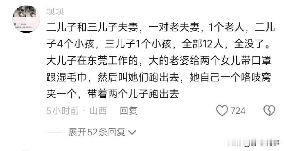 汕头一火灾事故中,一家四代多人不幸遇难,仅一户6人成功脱险。火情突发,逃生者沉着应对,先让两个女儿戴好口罩、用湿毛巾捂住口鼻撤离,随后腾出双手,左右胳膊各夹一个年幼儿子冲出现场。 逃生者熟练掌握火灾逃生技巧,临危不乱的处置,为自己和孩子赢得生机。其他家庭成员未能幸免于难,结局令人痛心。有推测称,逃生者所住楼层相对较低,客观上为逃生创造便利条件,其家人因在外地工作也躲过一劫。 这场火灾令人惋惜,也凸显沉着冷静心态和逃生知识储备的重要性。危急时刻的果敢与智慧,既挽救了一个小家庭,也为家族保留了血脉。这起事件提醒全社会,需重视防灾避险知识学习,提升全民应急处置能力,筑牢安全防线。