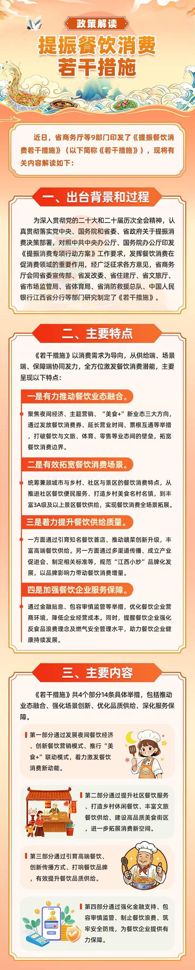 大江新闻讯江西日报全媒体记者殷琪惠报道:12月10日,记者从省商务厅获悉,我省9部门近日联合印发《提振餐饮消费若干措施》(以下简称《若干措施》),着力激发餐饮消费新潜能,推动餐饮业高质量发展。