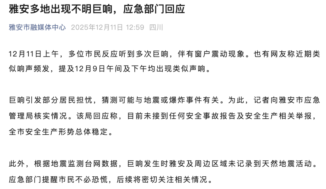 据四川省雅安市融媒体中心,12月11日上午,多位市民反应听到多次巨响,伴有窗户震动现象。也有网友称近期类似响声频发,提及12月9日午间及下午均出现类似声响。