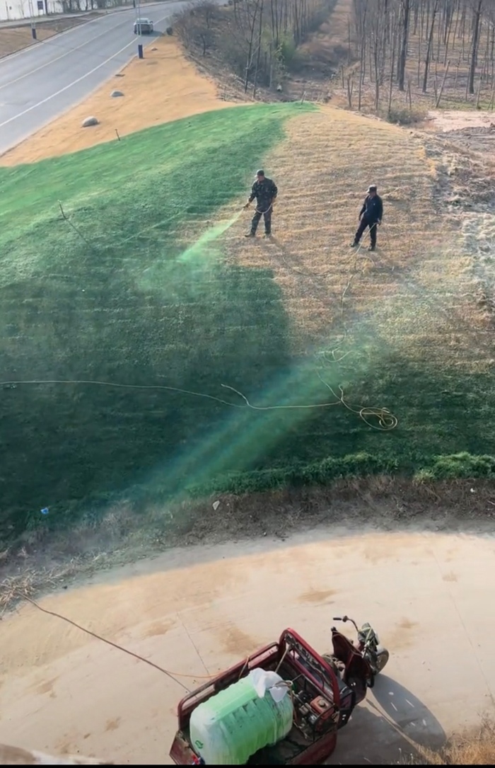 11日当天,新黄河记者就此事致电兴平市水利局,相关工作人员回复称,经其向施工人员了解,当天所喷洒绿色液体为营养液,目的是为养护草皮,“那块地方有时会有演出,也有人露营,草皮损坏比较严重,冬天喷洒营养液目的就是为养护草皮,(希望)来年长得会更好一点。”