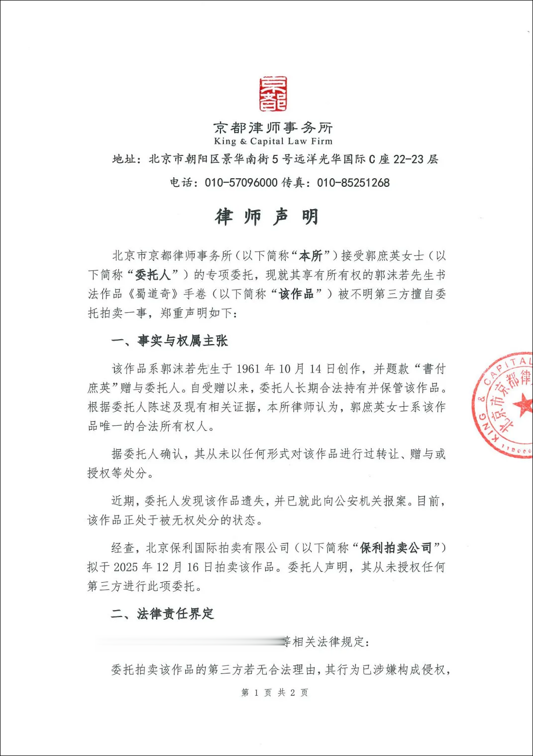 12月10日下午,北京市京都律师事务所发布律师声明称,该作品由郭沫若的女儿郭庶英所有,发现作品遗失后其已向警方报案。要求拍卖委托方北京保利国际拍卖有限公司中止拍卖,返还作品。