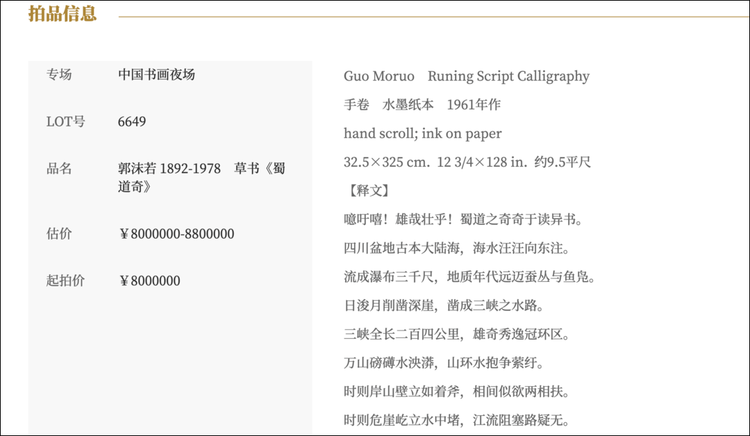 近日,郭沫若行草作品《蜀道奇》将现身拍卖会的消息受到收藏界关注,起拍价为8000000元,估价8000000—8800000元。