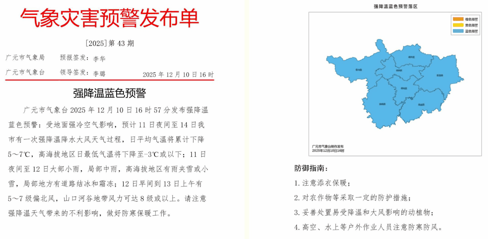 截至19时30分,共有12个盆地城市先后发布了强降温蓝色预警,分别是:广元市、成都市、德阳市、巴中市、眉山市、绵阳市、遂宁市、雅安市、内江市、资阳市、乐山市、自贡市。广元市同时发布了大风黄色预警。