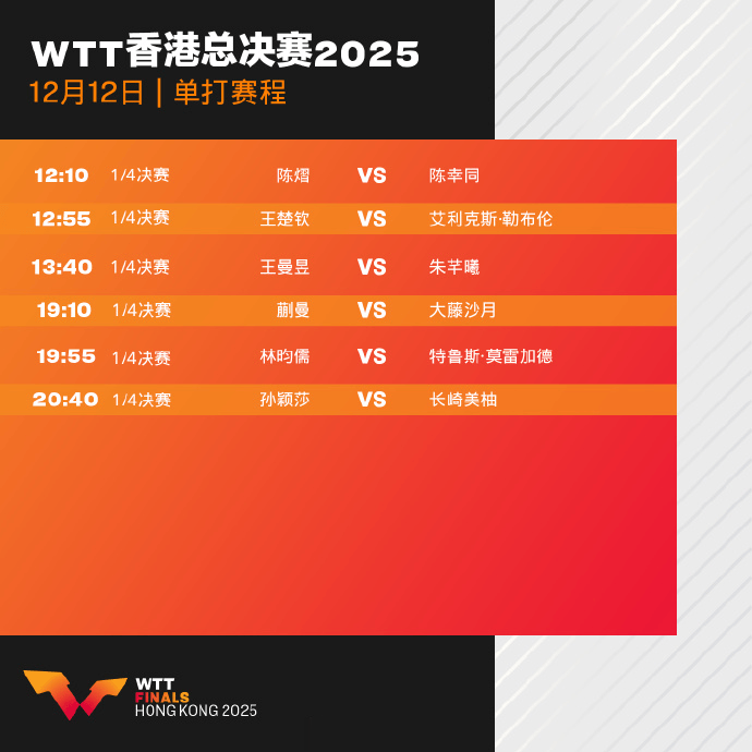 虎扑12月11日讯WTT香港总决赛今日赛程出炉。第三比赛日,单打进入全线进入1/4决赛,混双小组赛进行最后争夺。