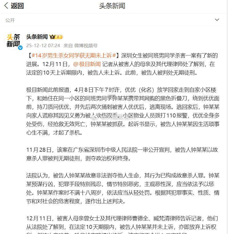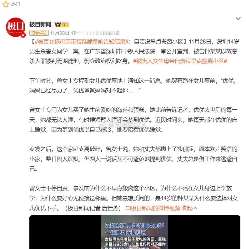 14岁男生杀女同学获无期未上诉 这种14岁就敢持刀、故意杀人的小渣子,你觉得他能被改造好吗?14岁已经到了明事理、懂是非的年龄了,但凭不满18岁这一项,被留下一条苟命快则10多年,这个小渣子就可以出狱,继续祸害人间了【钟某某(2010年4月出生)与潘某某(2010年5月出生)为深圳同校初三学生,两家同住一小区。潘某某父母应钟母请求,无偿接送其上下学近三年】被害女孩母亲带蛋糕跪墓前告知结果,被害人女生母亲自责没早点搬离小区,14岁女孩被男同学杀害母亲痛哭崩溃,14岁女孩遇害案受害者家属将抗诉