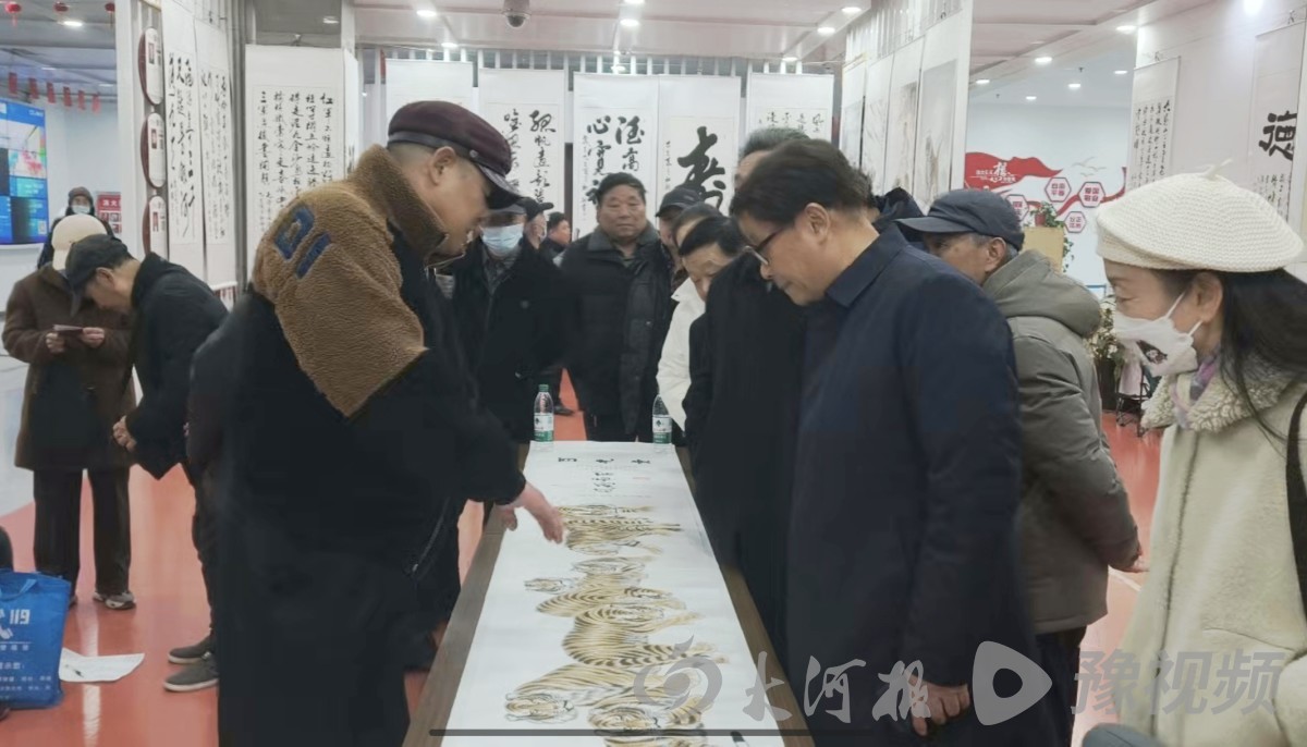 展览现场人头攒动、气氛热烈,大家观摩品鉴的同时感受着笔墨间的雄魂深情与银龄丹心。这次展览共展出马如钢精心创作的工笔虎画作品53幅、书法作品30余幅。
