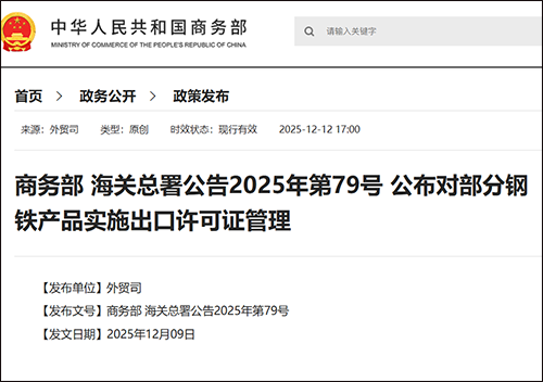 商务部网站12月12日消息,商务部、海关总署公布对部分钢铁产品实施出口许可证管理。全文如下: