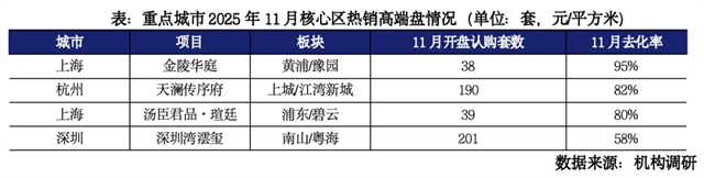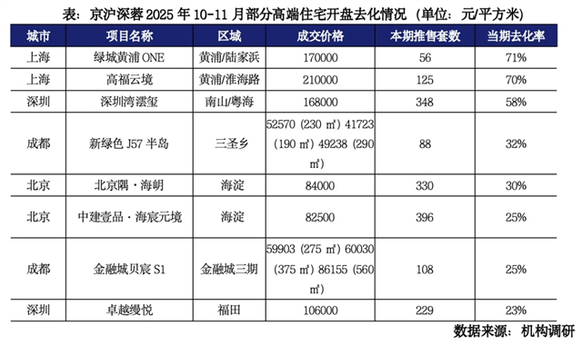 不过值得关注的是,步入四季度以来,核心城市京沪深蓉等高端市场亦有转冷迹象,各项目销售分化,并非所有项目均能热销。譬如上海黄浦区绿城黄浦ONE、高福云境等项目,去化率均为7成,未达到开盘即售罄预期。再如成都11月开盘的新绿色J57半岛、金融城贝宸S1等项目,去化率基本都在2-3成,市场热度显著降温。
