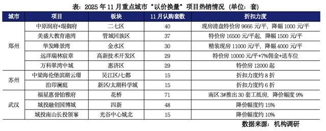 譬如苏州11月销量TOP10(含并列项目11个)中超七成项目因高性价比或以价换量入榜,以城市外围板块项目为主,中梁海伦堡滨湖云璟、泊印澜庭等项目折扣力度分别为8折和6折。