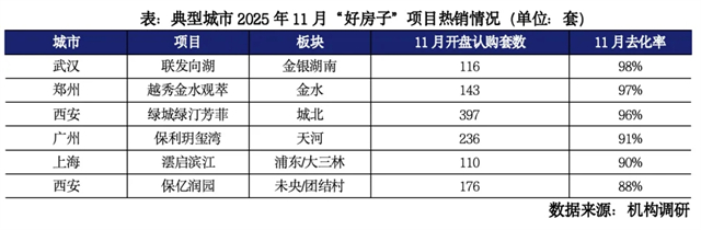 下表我们罗列了部分11月去化率居前产品力突出的“好房子”项目。可以看出,广州、西安、武汉、郑州等城市均有四代宅/新规项目热销。典型代表为西安绿城绿汀芳菲项目,区域核心地段+高得房率产品使得项目得以热销,11月去化率高达96%。一方面项目位于五大重点更新片区中规模最大的未央团结片区核心,周边为区域地标未央金融中心、轨交地铁10号线、商业综合体龙湖未央天街、唯一的“高新系”名校+团结实验学校。另一方面,89-108㎡户型得房率高达110%,89㎡不仅做到了三室两厅两卫设计,而且有约9.8m超大面宽,南向空中院落设计;建面约108㎡入户配置豪宅专属“家政间”、嵌入式玄关柜,以及南向空中院落、270°采光主卧套房等配置。121㎡户型得房率高达120%。
