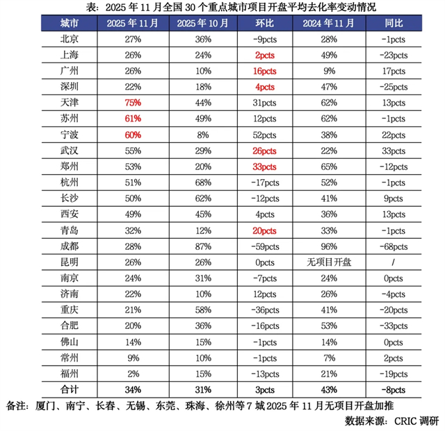 11月市场热度持稳,据CRIC监测数据,30个重点城市11月平均开盘去化率为34%,环比微增3pcts。厦门、南宁、长春、无锡、东莞、珠海、徐州等7城2025年11月无项目开盘加推。
