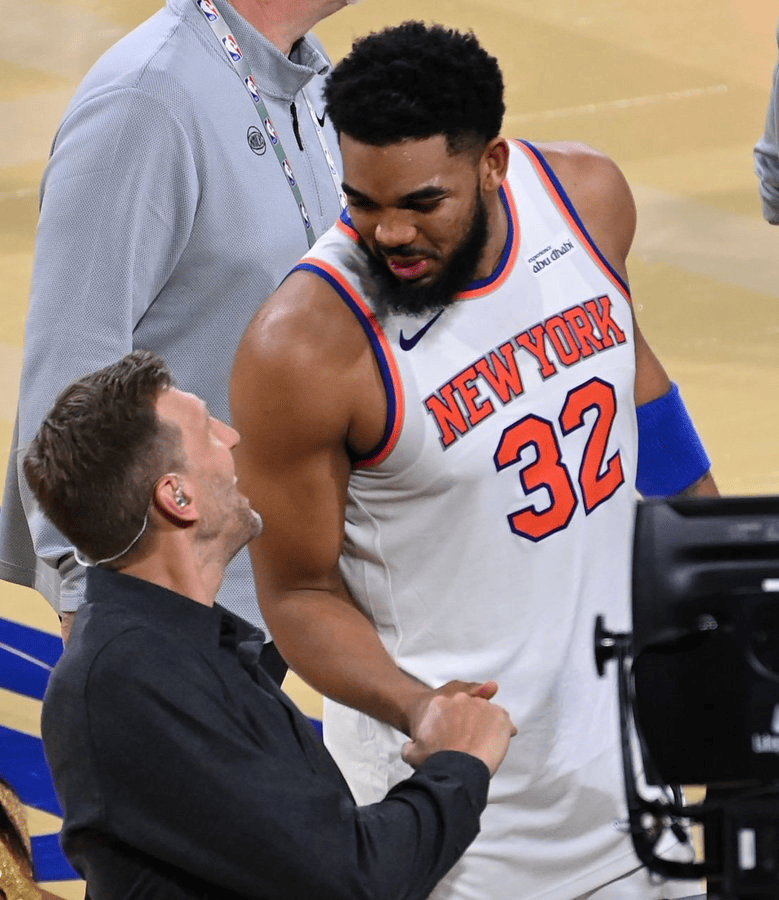 赛后,尼克斯在官方社交媒体上晒出了唐斯与NBA名宿德克-诺维茨基握手的照片,并配文:“史上最会投篮的两个大个子。”