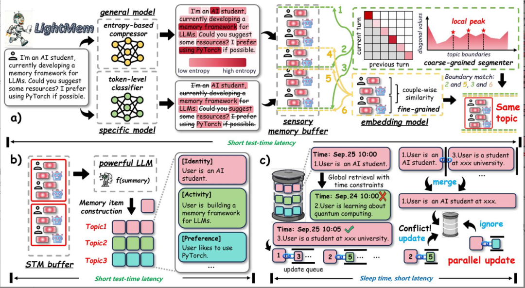 LightMem由三个模块组成:a)高效感知记忆模块,b)主题感知STM模块,以及c)在睡眠时间更新LTM模块。