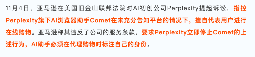 亚马逊起诉Perplexity,指控其AI助手Comet在未披露身份的情况下代表用户在亚马逊平台购物,违反服务条款。