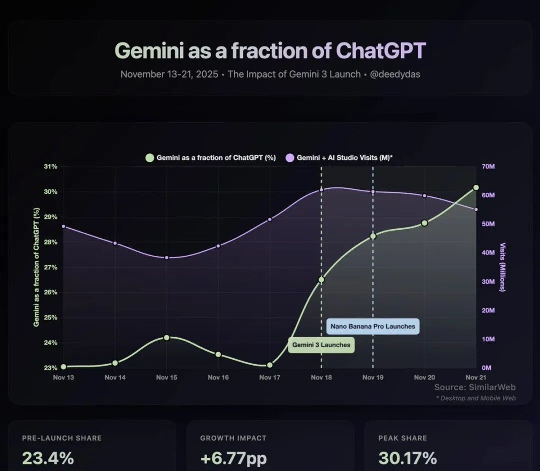 最近被马斯克和SamAltman点赞的Gemini3的用户数据快速增长,很形象的表明了这个趋势。