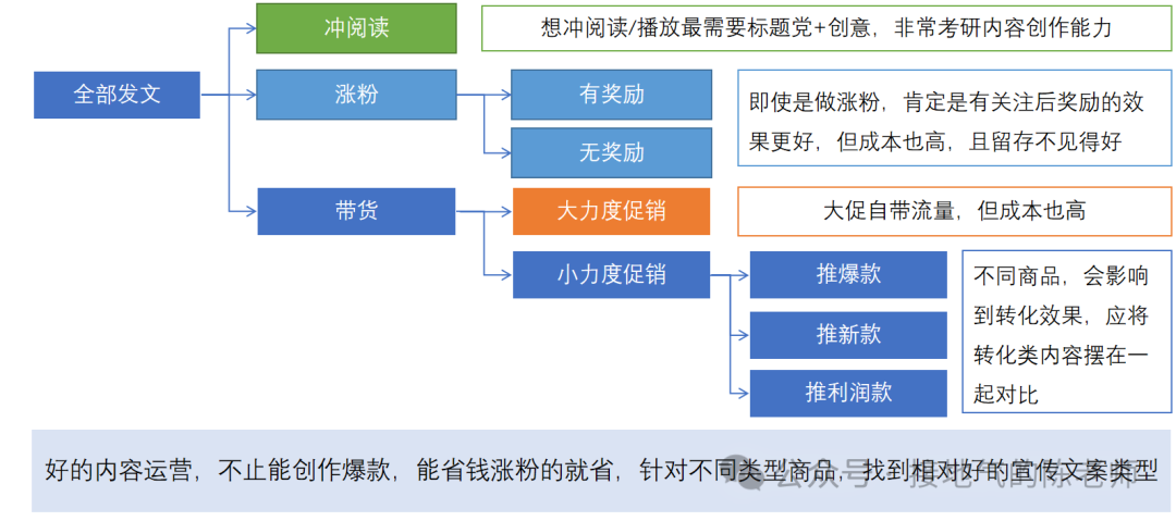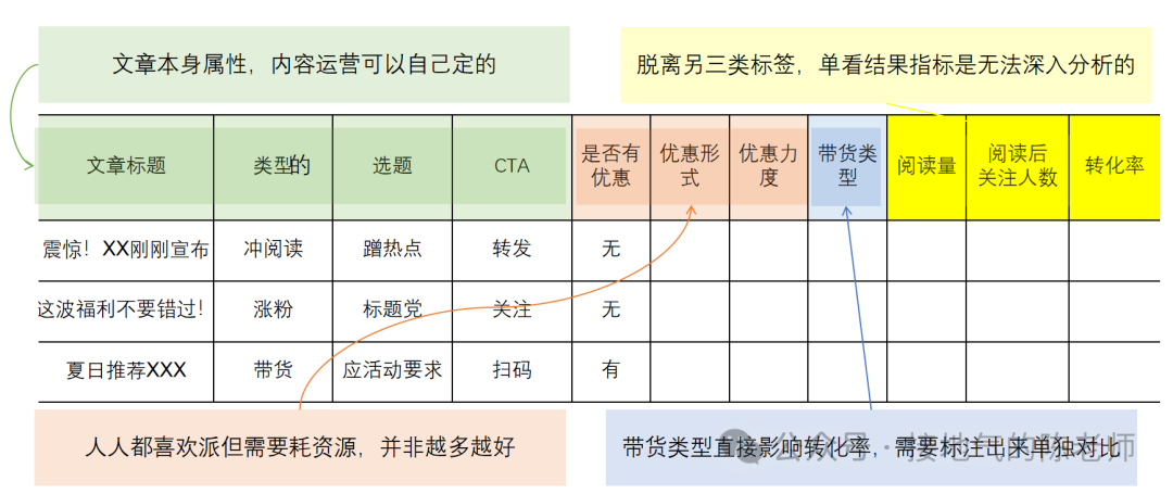 这样在分析效果时,先区分类型,涨粉/涨阅读量的内容往往不需要依赖别的部门配合,自己就可以做,所以单独看怎样做效果好,完全可以像娱乐自媒体一样蹭热点,博眼球。