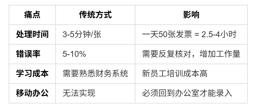 效率低下:一张发票3-5分钟,一天几十张就是数小时