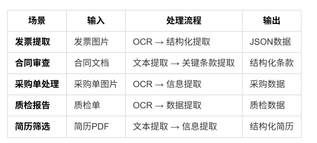 通用公式:文档/图片→OCR/文本提取→大模型结构化提取→数据校验→结构化输出