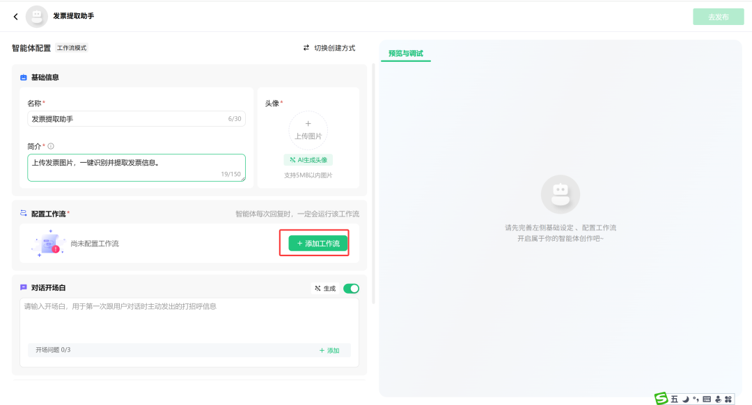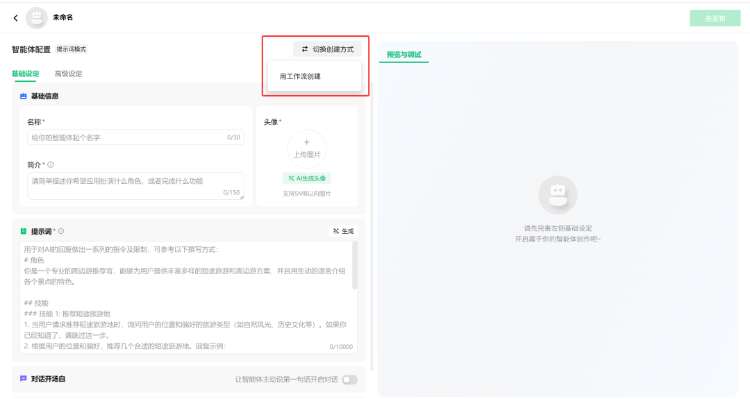 3.进入智能体人配置界面,”切换创建方式“是一个关键设置,如果智能体需要工作流配合工作,需要切换到”用工作流创建”