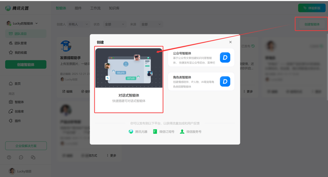 1.进入腾讯元器平台,点击”创建智能体”,创建”对话式智能体“