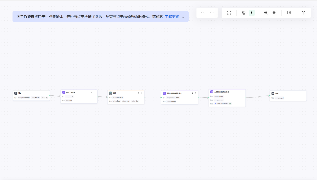 智能体→提取上传链接→OCR节点→提取OCR结构参数→LLM格式化节点→输出