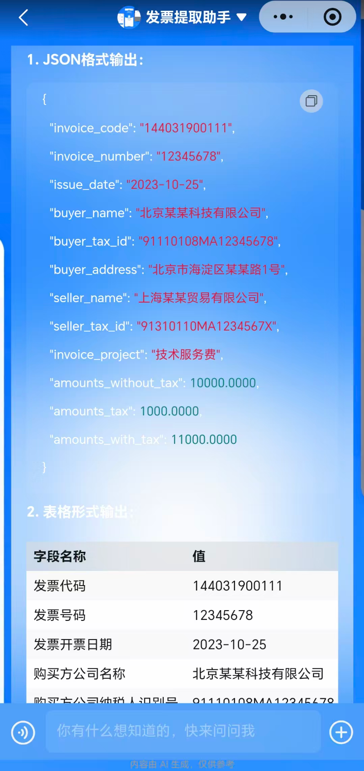 1、请严格按发票提取结果信息输出