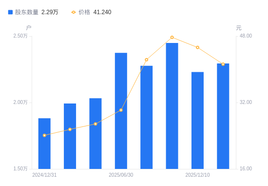 日期A股户数(户)流通A股户均持股数(股)户均持股市值(万元)2025-12-10222956370.1828.842025-10-31244865800.1827.672025-09-30227676238.1226.402025-06-30237405981.9718.052025-03-31203186989.4718.762025-02-28199227128.4018.202024-12-31188177547.0118.182024-09-30185797643.6819.412024-06-30165178597.9320.452024-03-31194187313.4219.15
