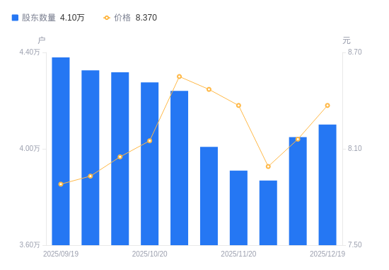 近一年(2024年12月31日至2025年12月19日),九鼎新材A股股东户数从3.57万户,增加至4.1万户,增幅14.84%,区间股价上涨58.34%。