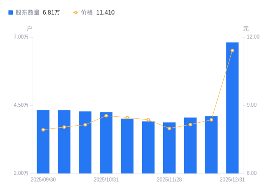 日期A股户数(户)流通A股户均持股数(股)户均持股市值(万元)2025-12-31680558846.1310.092025-12-194100814680.6312.272025-12-104048714869.5512.122025-11-283868615561.7912.422025-11-203909215400.1712.872025-11-104008015020.5412.712025-10-314240614196.6612.122025-10-204276014079.1311.462025-10-104317513943.8011.212025-09-304325613917.6911.02