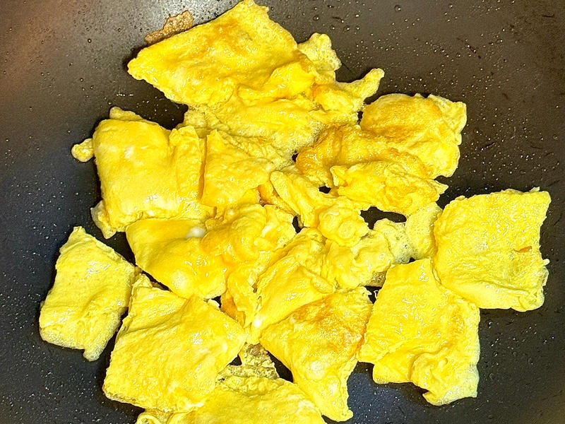 锅烧热,倒油别抠门,油多鸡蛋才膨胀得像小蛋糕。油温六成热,筷子插进去冒小泡,把蛋液沿锅边一圈倒,只听“呲啦”一声,蛋液迅速鼓起金黄大包,用铲子从边缘往中间推,让未凝固的蛋液继续流下去,重复两回,鸡蛋蓬松得能当枕头,半凝固就盛出,留底油备用。锅里再补少许油,小火下泡椒和蒜末,炒到红油渗出,空气里立刻飘出泡菜坛子味,嗅觉先被辣哭。
