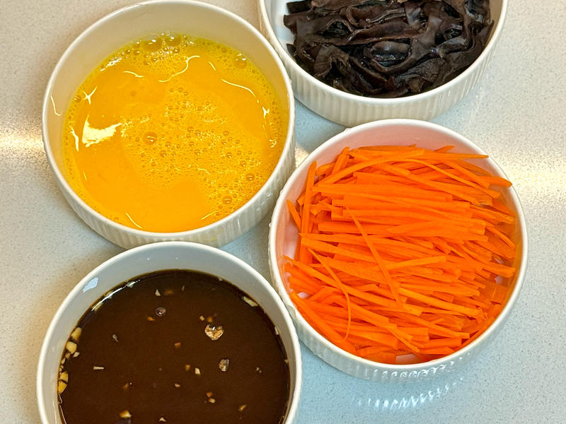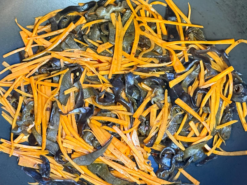 配角们排好队:泡辣椒两根、胡萝卜小半根、木耳三四朵、蒜两瓣、小葱一根。泡辣椒是灵魂,鲜红发量,自带发酵香气,没有就去超市抓一包“泡椒笋”回来,把笋啃了,辣椒留下。胡萝卜木耳负责配色加脆,切成指甲盖大小的丝,手残党直接上擦丝器,五秒完事。蒜剁末,葱切花,准备工作收工,全程不超过一首歌。