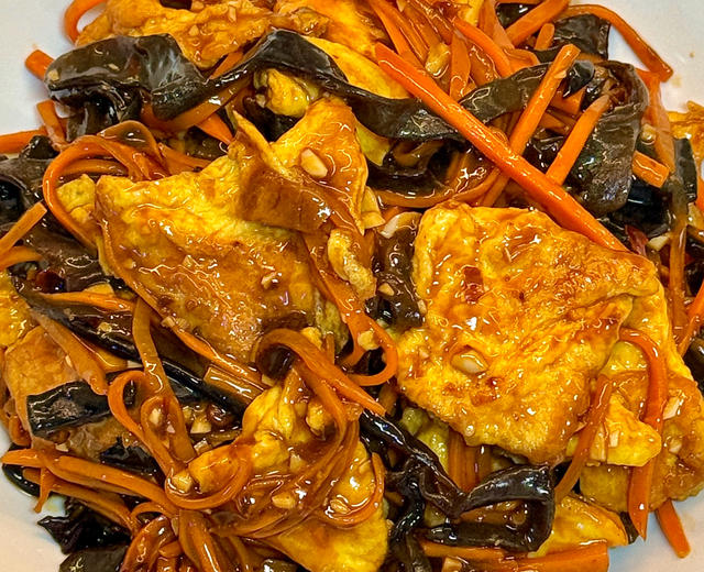 接着把胡萝卜丝、木耳丝丢进去,中大火快炒四十秒,蔬菜断生却仍保持脆感,颜色一深就喊停。把鸡蛋回锅,用铲子切成大块,让蛋香跟蔬菜拥抱。最关键一步:把调好的酱汁搅匀(淀粉爱沉底),哗一下倒进锅,瞬间沸腾冒泡,酸甜味直冲脑门。铲子来回推,让每一块鸡蛋都裹上亮晶晶的酱色,汤汁咕嘟到粘稠,像给食材穿了件玻璃雨衣,关火撒葱花,翠绿点缀,完成!