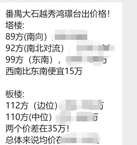 再换个思路,同样是番禺内部选筹:你是愿意去新造选个107平的旧规四房塔楼,还是选这里大石的新规板楼四房,还是小高层?