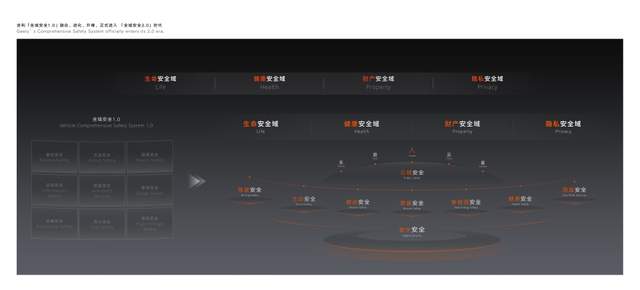 作为行业安全技术的先行者与引领者,吉利在“全域AI”技术体系的赋能下,以“AI为纲 责任为本”,基于原有的“全域安全”技术体系进阶打造“全域安全2.0”技术体系。结合智能时代的安全新需求和新挑战,“全域安全2.0”技术体系秉持“以人为尊”理念,通过技术升级、能力突破与范式创新,将侧重“整车安全”的视角升级为“人-车-路-云-星”的生态视角,旨在贯穿用户出行全场景、覆盖出行全领域、联动出行全生态;并以“生命零伤亡、健康零危害、财产零损失、隐私零泄露”四大安全愿景为指引,逐步构建的一套为消费者提供全面的安全保障技术体系。
