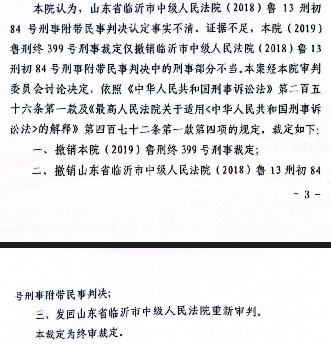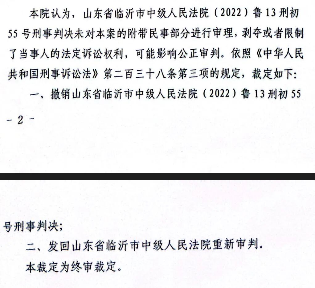 2022年10月24日,山东省高级法院二审作出(2019)鲁刑终399号刑事裁定书(原二审裁定),认为“原审判决认定事实不清楚,证据不足”,裁定撤销原一审判决中的刑事部分,发回临沂中院重新审判。但山东高院二审对附带民事部分既未审理、也未判决,为重审一审留下巨大程序隐患。