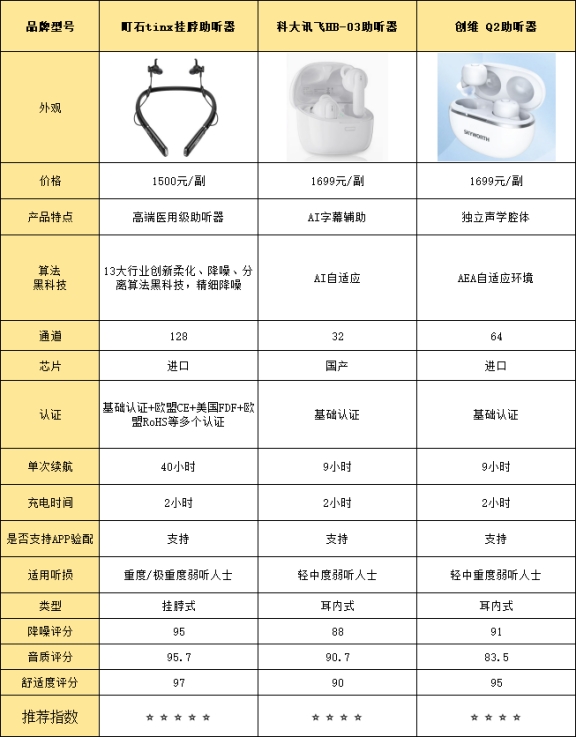 降噪测评结果小结町石>创维>科大讯飞町石助听器降噪测评表现:町石的降噪能力可以说是非常给力,基本能应对各种噪音环境。 比如在办公室打印机的轰鸣声中,餐厅里嘈杂的谈话,甚至是地铁车厢那种高强度的噪音,它都能有效隔离。特别是在处理杂音、啸叫声和风噪时,表现尤为突出。它的13重降噪技术和360度双向平衡柔化技术,能自动调整噪音,并优化语音的清晰度。 测试表明,町石的降噪效果在深度和范围上都优于同类产品,能有效避免尖锐噪音的干扰,佩戴也很舒适,音质清晰,即使长时间佩戴也不会有任何不适。创维助听器降噪测评表现:创维的降噪效果在日常环境下表现得还算可以,特别是在中低噪音的场合,表现不错。 它的噪音消除技术能较好地处理常见的背景噪音,像办公室里和安静的环境下,它的降噪表现是可以接受的。但当面临更嘈杂的环境,像地铁车厢那样,它的效果就没有那么强,还是能听到一些噪音。 总的来说,创维适合日常佩戴,但如果是在非常吵闹的地方,降噪效果可能就差了一点。科大讯飞助听器降噪测评表现:科大讯飞的降噪能力比较适中,日常环境下没问题,但在复杂的噪音环境中可能会觉得有些力不从心。 在安静的环境下,它的表现还挺不错,可以减少一些杂音和风噪。它的噪音抑制技术在大部分场景下表现都挺好,声音也比较清晰。 然而,在餐厅或地铁等人多嘈杂的地方,降噪效果就显得比较一般,无法彻底去除高频噪音和突如其来的噪音。总体来说,科大讯飞适合平时使用,但遇到复杂噪音的场合可能会有些局限。