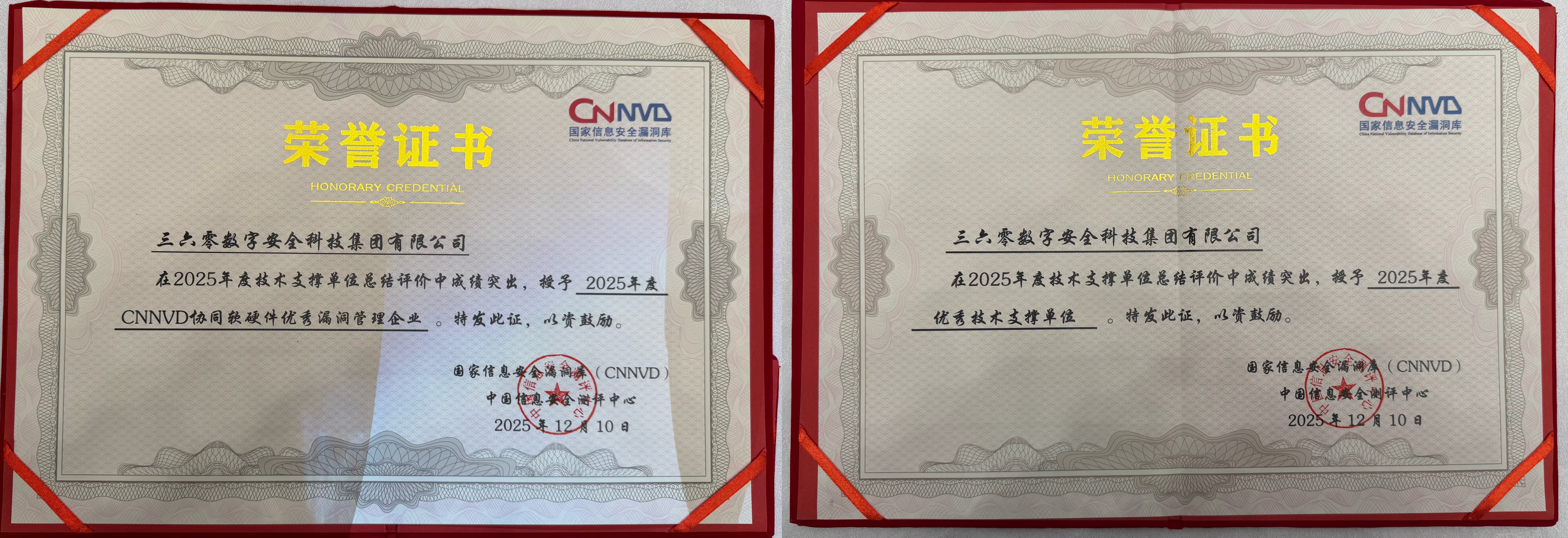 在本次大会网络漏洞治理生态分论坛上,三六零数字安全科技集团有限公司获颁由国家信息安全漏洞库(CNNVD)与中国信息安全测评中心授予的两项重要荣誉:“2025年度优秀技术支撑单位”及“CNNVD协同软硬件优秀漏洞管理企业”,体现了其在国家漏洞治理生态中的突出贡献与技术支撑能力。