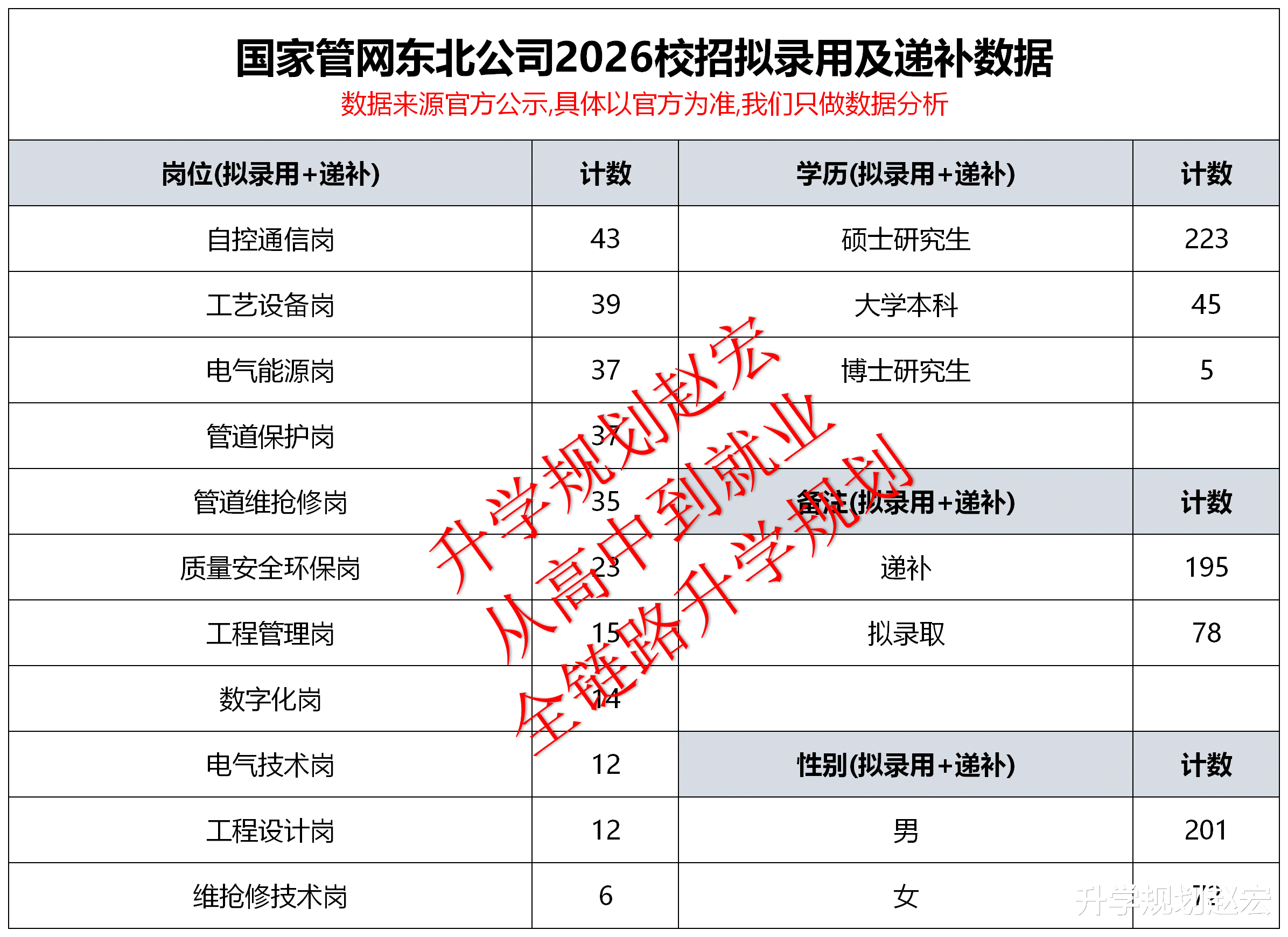 本文咱们来看看,国家管网东北公司2026校招拟录用及递补数据,我们的数据分析都是加上递补,一个原因是最终录用有递补的同学,第二个我们看的是大学专业的可能性,给报考做一定的参考。我们要的不是最终的那个名单,没有意义。总共273人,拟录用78人,递补195人。男生201人,女生72人。从学历上来看,硕士研究生223人,博士研究生5人,大学本科45人。岗位有自控通信岗、工艺设备岗、电气能源岗、管道等相关岗位,看岗位也就知道,需求的专业其实很多的,不只是石油类的专业。接下来咱们看看具体的录用院校和专业情况。