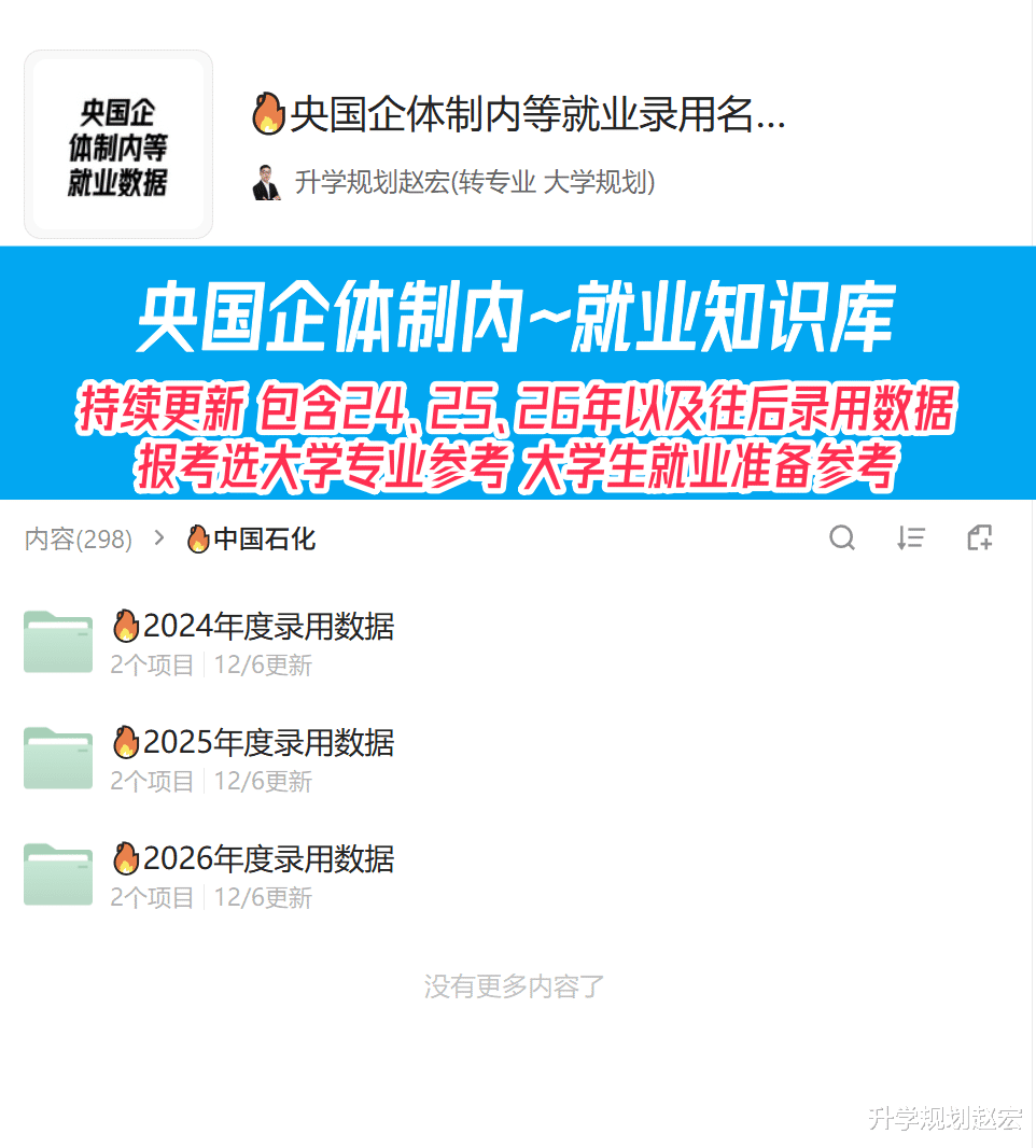最近我们更新了中石化、国家管网等部分单位的2026年校招录用数据,大家可以去对比看看,一个是看最近几年的录用变化,二是看不同地区的单位录用变化,而不是看总数,总数其实会有数据的偏差。这也是为啥我说有坑的原因,很多家庭看到某所大学人数多,然后就去报考了,可是忘了专业也需要匹配。还有对于大部分省份来说,依然有专业调剂,我们目标是行业院校的行业专业,结果被调剂到了冷门,那么未来就跟我们想去的行业没啥关系了,虽然是在行业院校就读,但是没任何优势。同样我们想就一定能够保得住吗?知道好没用,能够录取才算,能读得到才算。所以转专业的数据和就业的数据,就需要提前研究清楚,这些数据都在咱们的知识库里面有,同样保专业咱们也专题直播。