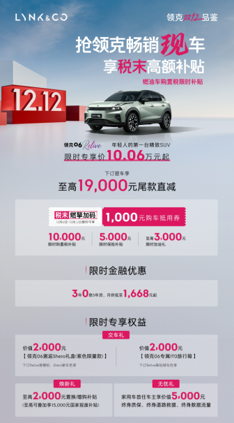在10万级高颜值SUV的激烈角逐中,领克06 Relive凭借协调且有辨识度的设计,打破了部分车型“颜值堆砌”的违和感,再叠加10.06万起的限时价和多重透明福利,解决了“颜值高但无优惠”的市场痛点。其产品设计与购车政策形成的组合优势,让它成为12月车市中兼顾颜值与实惠的优选,意向购车者可到线下门店试驾,把握这波限时购车契机。