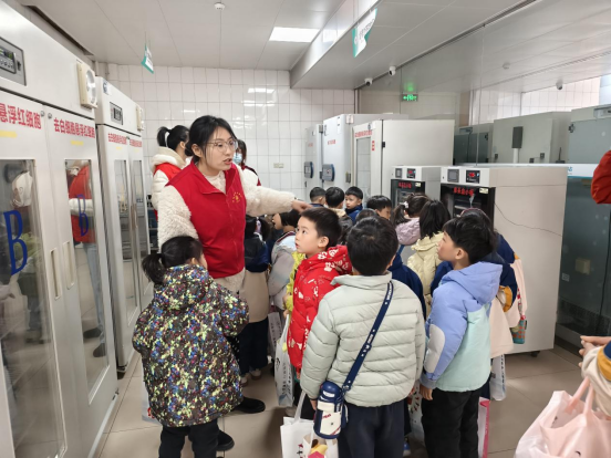 科普课堂结束后,孩子们在血站工作人员、志愿者及班级老师的精心组织和安全保障下,分组进行了实地参观。在工作人员的分组带领下,孩子们井然有序地探访了血站的关键工作区域。从血液的采集、检测、分离制备到储存发放,孩子们零距离观察了“一袋血”从爱心捐献到用于救治所需经历的严谨、科学的旅程。参观过程安全顺畅,部分孩子在等候间隙还体验了趣味手工活动。