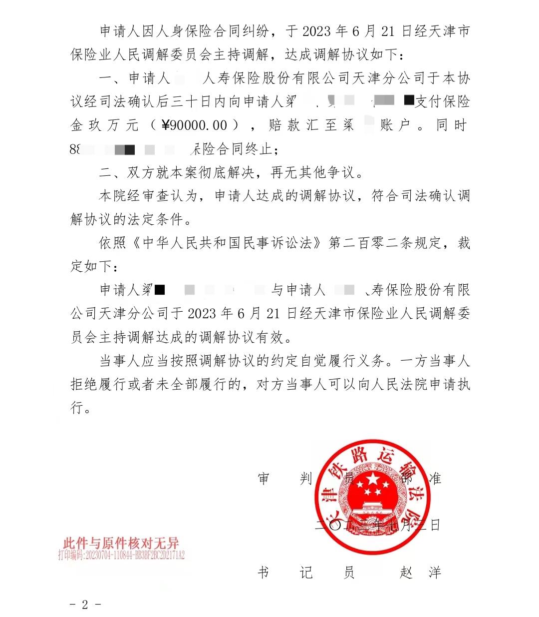 XX人寿保险股份有限公司天津分公司于本协议经司法确认后三十日内向申请人梁XX支付保险金玖万元(¥90000.00) ,赔 款 汇 至 梁XX账 户 。同 时8808XXXX保险合同终止。