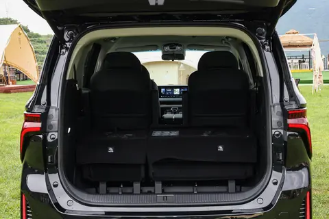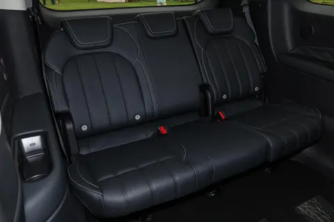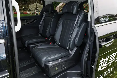 作为一款 MPV,空间表现无疑是核心竞争力之一,我们特意找了一位身高 180cm 的体验者来实测。调整好前排座椅,体验者的头部还有一拳两指的余量,腿部空间则相当充裕,最大可达到 395mm,大概两拳多的距离,即使长途驾驶也不会觉得局促。来到第二排,独立座椅的舒适性很好,调节至合适位置后,头部空间一拳左右,腿部空间最大能到 416mm,约两拳半,而且座椅支持左右调节,中间的通道宽度有 200mm,进出第三排时不用特意侧身。最让人惊喜的是第三排,体验者坐进去后,头部空间有一拳(985mm),腿部最大能留出 513mm,大概两拳的距离,这在同级别车型里算是挺不错的表现,完全能满足成年人长途乘坐的需求。