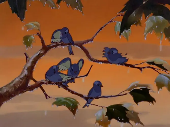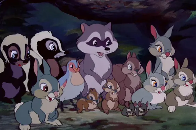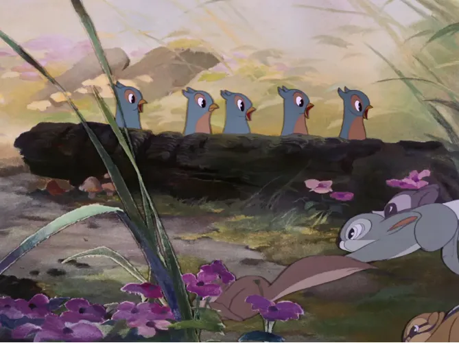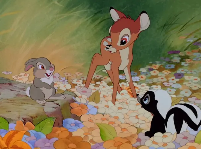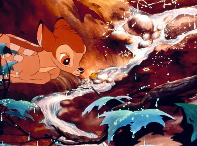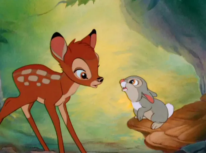 其次,站在成年人的视角去拍摄儿童动画片的时候,还会陷入到另一种困境,那就是思想的成熟性,成熟的思想自然会对于影片中的片段做一些属于成年人的搭配,但是,本片没有这么干。小鹿斑比的视角,小鹿斑比朋友们的视角,小鹿斑比母亲以及父亲的视角都是属于各自的角色该有的表现,而这些表现却又都归结于一点,那就是小鹿斑比眼中的所有人的视角,这样一来,回路就形成了。